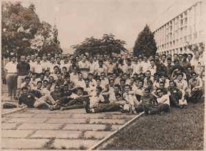 Sakane – Houve muitas mudanças ao longo do tempo. O próprio conceito de DC já era discutido. No ano anterior à minha entrada, 1963, havia sido realizado uma Assembleia Geral do Centro Acadêmico Santos Dumont – Casd para discutir uma tese sobre a Disciplina Consciente. O trote era o principal mecanismo de aculturação, o que pode ser observado na foto (abaixo) da turma de bixos em1964, onde há uma representação clara das tradições e rituais de integração característicos do ITA naquela época. Os alunos, todos com gravatas-borboleta, junto ao sininho preso à calça e à placa de “bixo” no peito — não são simples acessórios, mas sim partes do “uniforme” simbólico utilizado para distinguir e identificar os calouros.
