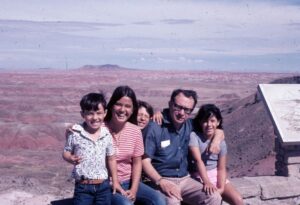 À esquerda, Pacitti aparece com os filhos ainda pequenos; e na segunda foto, um registro das bodas de ouro do casal (Eunice e Tércio), agora com os filhos adultos (Márcia, Esther, Tercinho e Marcos) ao lado — uma família construída com amor, raízes e legado