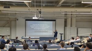 Em seguida, o Dr. Rodrigo Pastl, gerente de Transformação Digital da CNI – Confederação Nacional da Indústria, ressaltou a urgência de alinhar a educação em engenharia às demandas reais da sociedade e do setor produtivo. Para ele, é fundamental tornar o ensino mais ágil, conectado e interdisciplinar, superando o descompasso entre teoria e prática e ampliando a interação entre universidades e indústria.