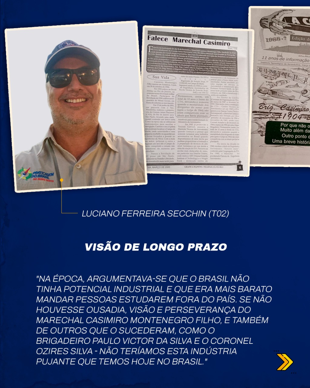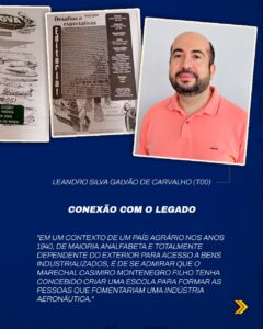 Ele aceitou, e transformou aquele instante em aprendizado profundo: “Apesar de não ter conhecido Casimiro em vida, eu o admirava profundamente pela forma pragmática com que lidava com grandes desafios. Nos quatro anos em que cursei o ITA, antes do seu falecimento, procurei as mais diversas fontes sobre o Marechal — feitos, histórias, causos, inclusive no jornal A Cova, do Casd, onde fui editor e colaborador.”
