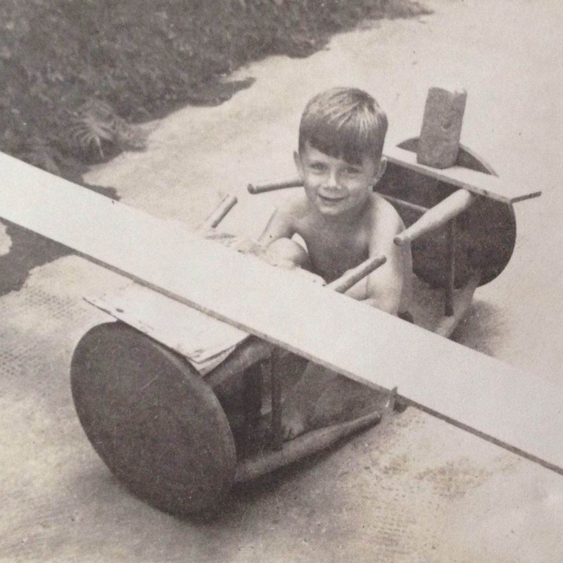 - Primeiro “planador” aos 4 anos, feito com bancos, tábuas e tijolos.